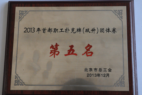 比赛采用团体赛形式,共有48支代表队,每个队由4~6名选手组成。我校校工会棋牌协会应邀参加比赛,我校职工、棋牌协会会员姚国强、王景群、白桂香、李勇、吕茂相组成中国政法大学“军都山”代表队。经过两天8轮的预赛、半决赛、决赛的奋力拼搏、团结合作,我校“军都山”代表队从48只参赛队伍中脱颖而出获得了“2013年首都职工扑克牌(双升)团体赛”第五名,为学校赢得了荣誉。