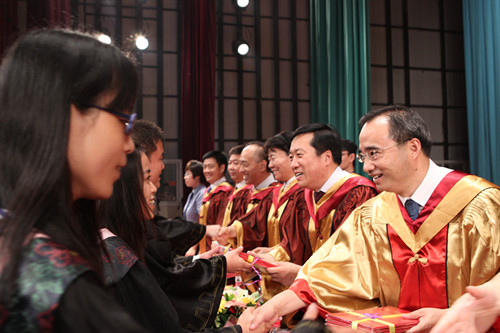 民商经济法院院长王卫国教授代表教师对毕业生表示了祝贺。他表示,大学是实现精神完美,造福社会的过程;大学是学无止境,增长学问、增长人格修养的过程;大学是培育人,对知识产生尊崇感和敬畏感的过程。他希望在座的同学们在离开学校时带着这种尊崇感和敬畏感,不断提升人格修养,不断提升事业成就。并为同学们演唱了《毕业歌》:“同学们,大家起来,担负起天下的兴亡……”。