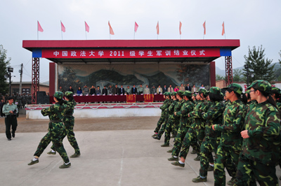 9月15日上午,2011级学生军训结业仪式在北京八达岭学生军训基地隆重举行,为期14天,共2016名学生参加的新生军训划上了圆满的句号。北京市学生军训工作办公室主任张培松大校、我校党委副书记兼副校长冯世勇、延庆县武装部部长王林上校、学生军训团团长高峰少校、政委周海滨中校、参谋长唐瑾亮、北京八达岭学生军训基地主任谭延桐以及我校武装部长兼军训团政委姜言发、学生处处长卢少华、党委宣传部部长刘长敏、保卫处处长林发军、校团委书记王明宇、法学院分党委书记刘大炜、民商经济法学院分党委副书记王洪松、刑事司法学院分党委副书记王敬川、国际法学院分党委副书记顾永强、政治与公共管理学院分党委副书记杨怀军、人文学院分党委书记杨军、外国语学院分党委书记赵云鹏、新闻与传播学院分党委副书记尚武、军训办公室主任吕宗礼等有关部门负责人出席了结业仪式。