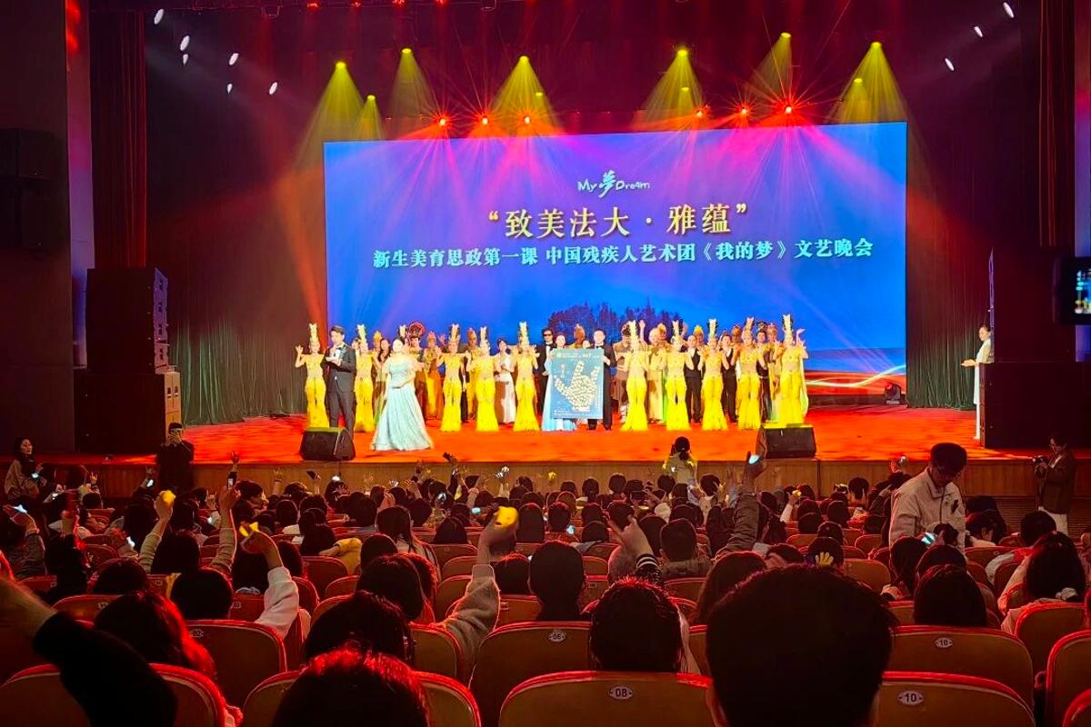 10月10日晚,中国政法大学昌平校区礼堂内暖意融融,“致美法大·雅蕴”新生美育思政第一课中国残疾人艺术团《我的梦》文艺晚会在此倾情上演。1300余名师生齐聚一堂,共同欣赏了这场超越言语的艺术盛宴。从经典舞蹈《千手观音》的华美绽放,到《黄土黄》的雄浑气势,艺术家们以精湛的技艺和饱满的情感,展现出生命的无限可能与坚韧力量。每一个动作、每一段旋律,都在生动诠释“生命总有价值”的深刻内涵。校党委副书记黄瑞宇出席本次晚会。