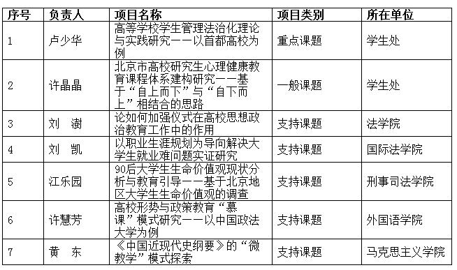 日前,北京市教工委公布了2016年度首都大学生思想政治教育课题中标结果。我校立项取得新突破,共7个项目获得立项,其中重点课题1项,一般课题1项,支持课题5项。现将获批项目予以公布: