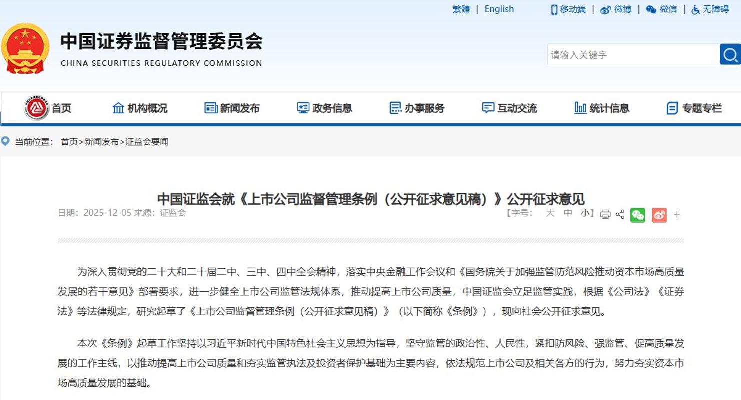 (央视财经《财经态度》)中国证监会日前发布《上市公司监督管理条例(公开征求意见稿)》,向社会公开征求意见。