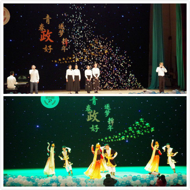 公一班充满民族风情的新疆舞蹈《掀起你的盖头来》,政治班同学深情款款的独唱《一万个伤心的理由》,独具特色的玩泥巴清唱团带来的歌曲《简单爱》,大二的师兄师姐精心准备的舞蹈《You’re Pitiful》等精美节目不断上演,晚会现场掌声欢呼声不断,每一次深情演唱每一个优雅舞姿都使全场气氛极为活泼兴奋。此外,公二班同学演绎的话剧《缘》,来自天空印象美工社的舞蹈《You Think》等节目,均为晚会增色万分。充满惊喜的互动环节,别出心裁的视频连接,时刻传递着同学们心声的微信墙,使得晚会更加丰富多彩,充满新意和乐趣。