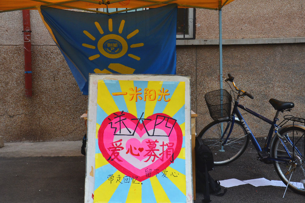 本次活动面向全校大四同学募捐无法带走的书籍、衣物等可以重复利用的物资,根据需求捐往木兰社区、太阳村或随支教队带往支教地小学。部分没有需求的物资,也将通过一米阳光变卖换取现金,为支教学校购置图书、体育器材等物品。