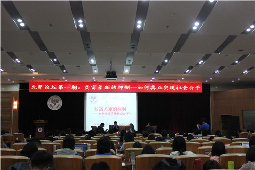 4月22日晚19时,由我院学生会主办的第一期先声论坛在学生活动中心学术报告厅成功举行。本次活动以“贫富差距的抑制——如何真正实现社会公平”为主题,邀请到了中国人民大学的哲学院周濂教授、我校人文学院邓文初教授、法学院汪庆华教授和政治与公共管理学院庞金友教授。四位嘉宾与同学们深层次探讨“两会”结束后引发热议的一系列社会公平问题,探寻巨变中的未来中国发展之路。