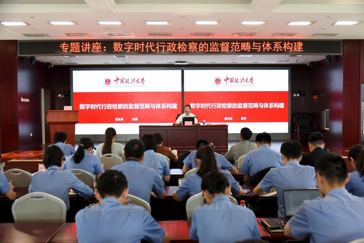 共建活动结束后,解志勇以“数字时代行政检察的监督范畴与体系构建”为题开展专题讲座。讲座采取线上线下同步进行的方式,全市检察机关行政检察业务条线的检察人员、西藏拉萨市院及堆龙德庆区院、内蒙古凉城县院的检察人员代表通过视频参加讲座。讲座中,解志勇从数字技术赋能法治政府的双重效应、传统行政检察面临的监管难题、数字行政检察的监督新范畴及体系构建四个方面为检察监督提出了新思路,明晰了数字行政检察面临的挑战、机遇及发展方向,为行政检察工作优化监督路径注入创新动能。