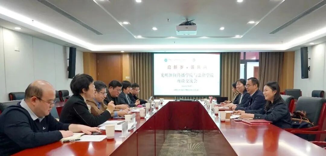 1月4日,法律学院与光明新闻传播学院在海淀校区图书综合楼719会议室座谈交流,以“启新岁·谋共兴”为主题,共商学科交叉融合、协同发展大计。光明新闻传播学院党委书记韩伯君,纪委书记、副院长阴卫芝,副院长万蓉,研工办主任刘勤;法律学院院长许身健,党委书记刘建,副院长刘智慧,纪委书记、副院长梁敏,综合办主任吴荻,党委专职组织员高杰峰参加座谈。座谈会由梁敏主持。