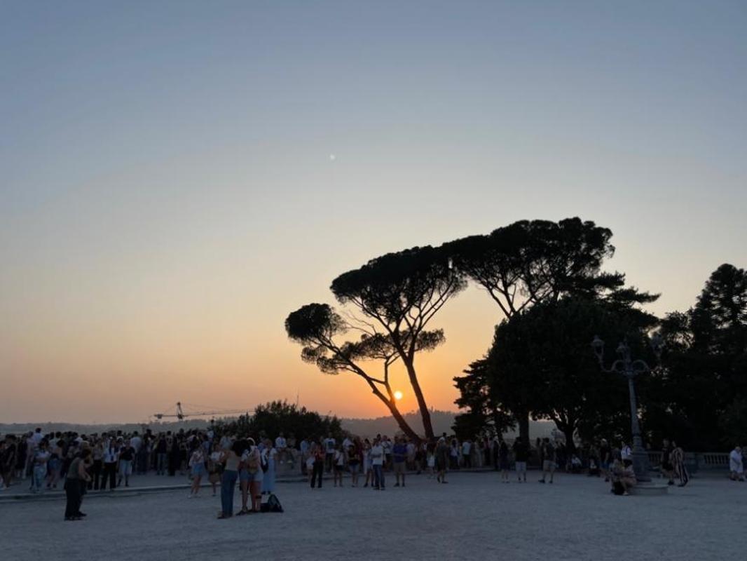 周末,我与室友会去博尔盖塞公园。我们在公园的沙地上散步,累了便拿出自带的水瓶,到路旁的“大鼻子”饮水点接凉水,一饮而尽。临近傍晚,我们来到公园的大露台,人群聚集在这里观看落日。看完日落,我们从另一个长满三角梅的出口离开,便到了西班牙广场。第一次去时,我很惊奇:没想到这两个地方能这样串联起来,好像任意门突然打开了一般。